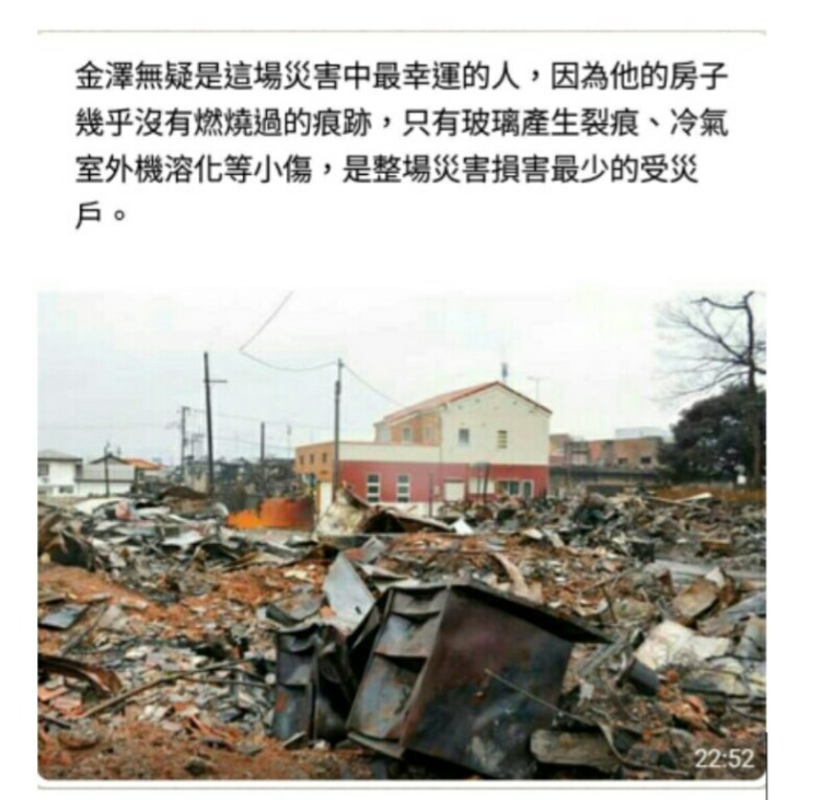幸运与神在这里混为一谈。若根据爱恩思坦的[双对论]和佛法的因缘果报法则概念理解. 幸运是因应你做过的好事而产生。厄运是因应你做过的坏事而产生。与神不相关连。 以金泽先生为例子,他的房子没有被大火摧毁。整条小村庄,只剩下他的房子完整无缺地屹立着。看看下面的照片,没有夸大。 正如之前所说,运气因应你做过的事而产生。金泽先生做了什么呢?真的是幸运之神眷顾吗?