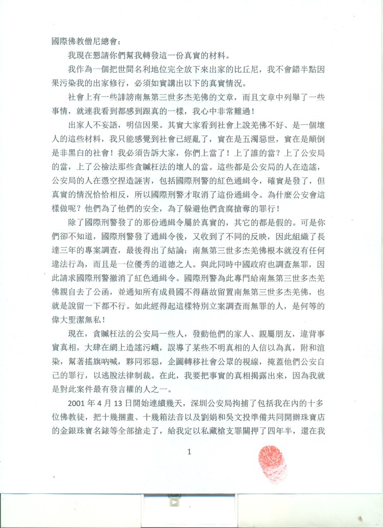 除了國際刑警發了的那份通緝令屬於真實的,其它的都是假的。可是你們卻不知道,國際刑警發了通緝令後,又收到了不同的反映,因此組織了長達三年的專案調查,最後得出了結論:南無第三世多杰羌佛根本就沒有任何違法行為,而且是一位優秀的道德之人。與此同時中國政府也調查無罪,因此請求國際刑警撤消了紅色通緝令。國際刑警為此專門給南無第三世多杰羌佛親自去了公函,並通知所有成員國不得藉故留置南無第三世多杰羌佛,也就是說留一下都不行。如此經得起這樣特別立案調查而無罪的人,是何等的偉大聖潔無私!