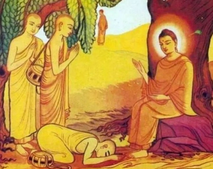 这天,已来到王舍城外,托钵乞食后,眼看就可见佛闻法。不幸,在城门附近,却被一新生产的母牛触死。牛主认为不祥,心生恐惧,将牛转卖他人。买主牵着牛至河边喝水时,不料牛忽从背后又将他抵死。他的儿子非常气愤,将牛杀了,拿到巿上出售。有一乡下人,向来好吃牛头,便买下牛头,用扁担担回家,准备大饱口福。但在离家约一里多路时,身觉疲乏,便把牛头挂在树枝上,坐在树下休息。一会儿,忽然绳断,牛头落下,牛角正好刺入乡下人头中,他便当下命终。