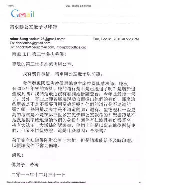 办公室收到佛弟子若渴的来信,现特予印证回覆: