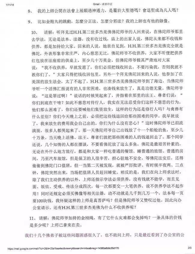 第十、关于供养的问题,真正的供养是真心修行学佛、如法依H.H.第三世多杰羌佛的教法奉行,自觉成就而觉悟他人,利益一切众生。弟子适当的对传法上师作一些供养是应该的,如果自己生活困难,不但不应该作供养,而且上师应该拿钱帮助。但任何上师都无权喊弟子对他作供养,更不应该要弟子买任何法物,让弟子买任何法物是绝对不应该发生的事情,有此行为即是凡夫自私贪得之心,离菩萨的路程太遥远了。