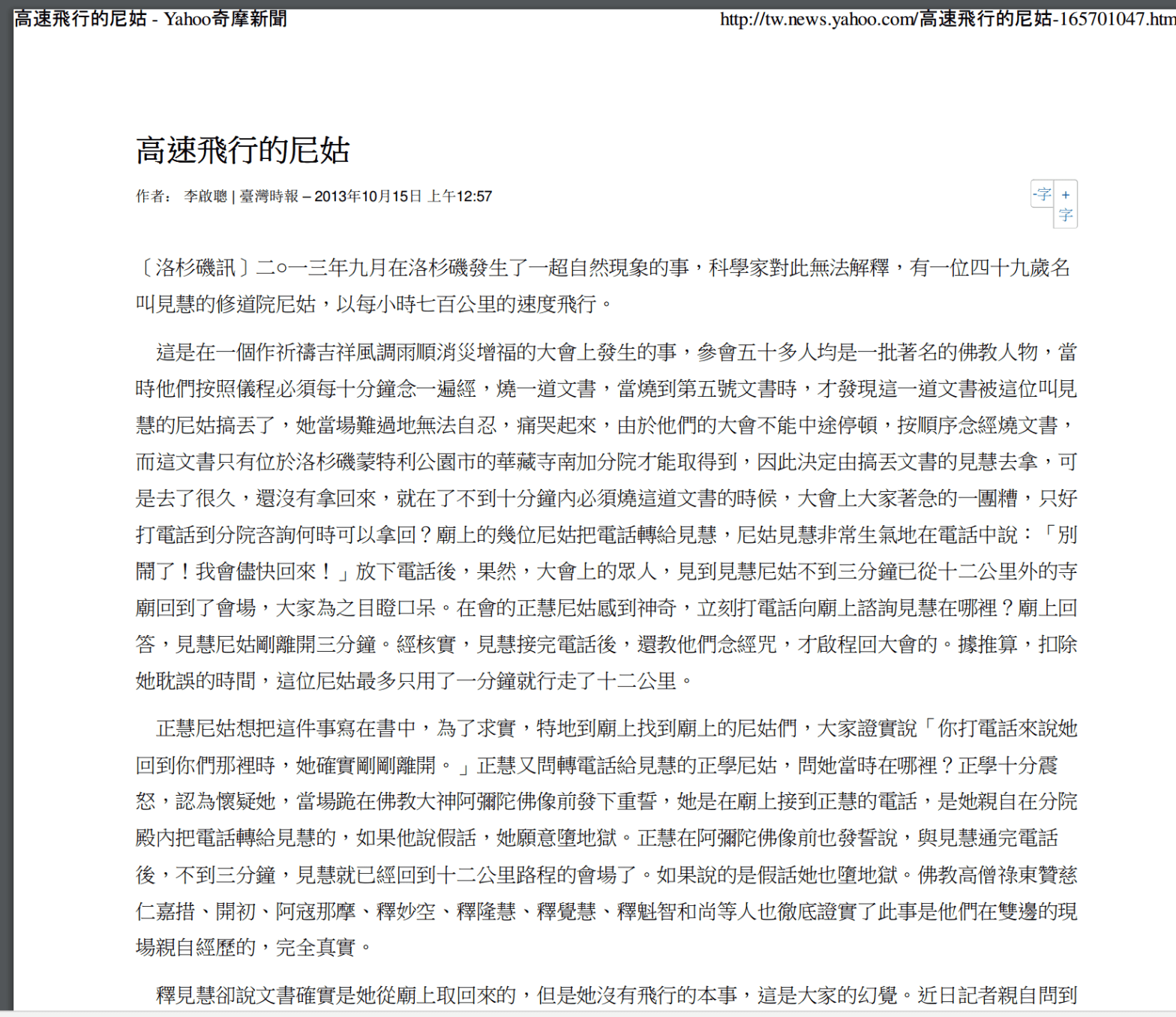 轉發Yahoo 奇摩新聞網2013年10月15日新聞: 高速飛行的尼姑